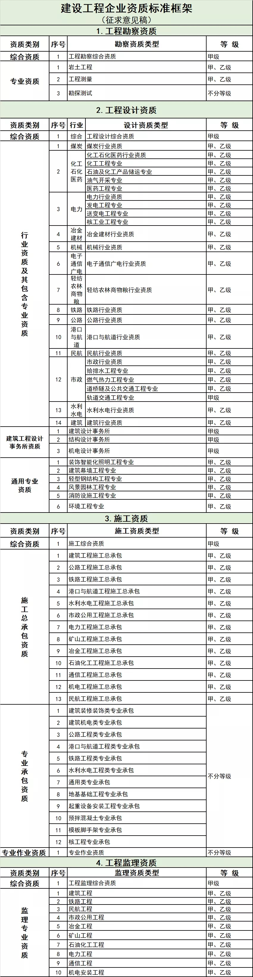 附:《建設(shè)工程企業(yè)資質(zhì)標(biāo)準(zhǔn)框架(征求意見(jiàn)稿)》