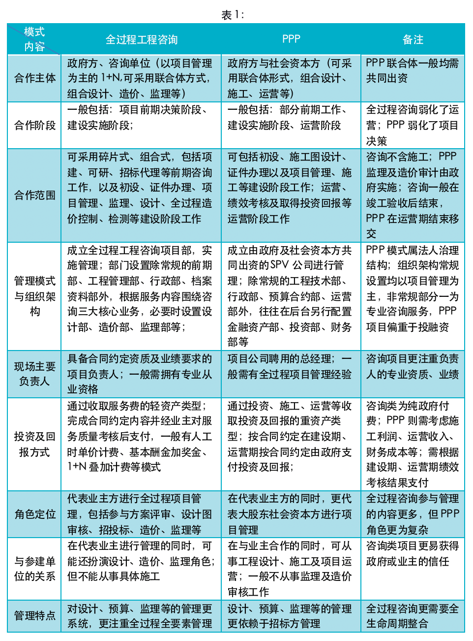 從上面的分析中不難看出,PPP項(xiàng)目關(guān)注合法合規(guī)手續(xù),全過程咨詢關(guān)注技術(shù)及管理協(xié)調(diào);PPP項(xiàng)目更關(guān)注投資收益及增值回報(bào),全過程咨詢關(guān)注投資控制及進(jìn)度;PPP項(xiàng)目服務(wù)鏈更長(zhǎng),全過程咨詢重點(diǎn)是建設(shè)期。