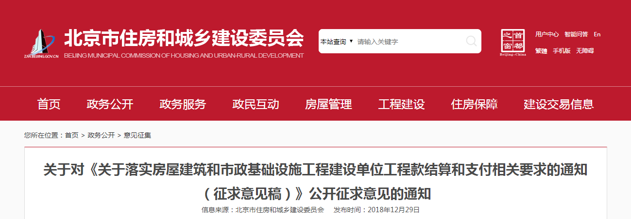 2019年1月17日,北京市住建委發布《落實房屋建筑和市政基礎設施工程建設單位工程款結算和支付相關要求的通知》,其中明確指出: