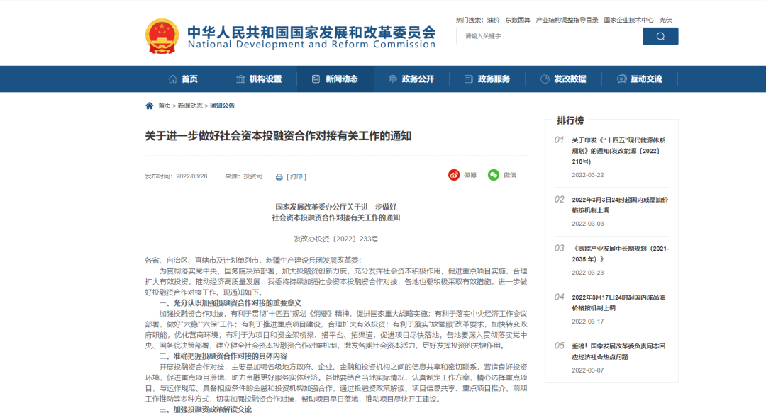 3月28日,國(guó)家發(fā)展改革委辦公廳印發(fā)《關(guān)于進(jìn)一步做好社會(huì)資本投融資合作對(duì)接有關(guān)工作的通知》(以下簡(jiǎn)稱(chēng)《通知》),部署各地積極采取有效措施,進(jìn)一步做好投融資合作對(duì)接工作。