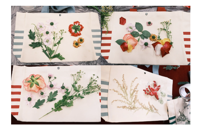 大家挑選出自己喜歡的植物后,在潔白的帆布包上精心構(gòu)思布局,將植物設(shè)計(jì)成自己喜歡的圖案,用透明膠固定,然后用橡膠錘耐心敲打,直至看清植物脈絡(luò)紋理,均勻撕開(kāi)膠帶,自己設(shè)計(jì)的圖案通過(guò)拓染就印在了帆布包上。
