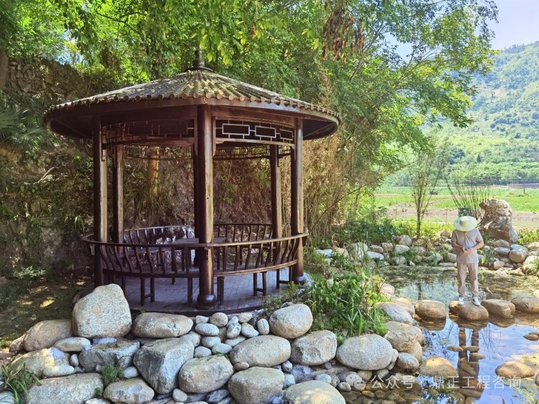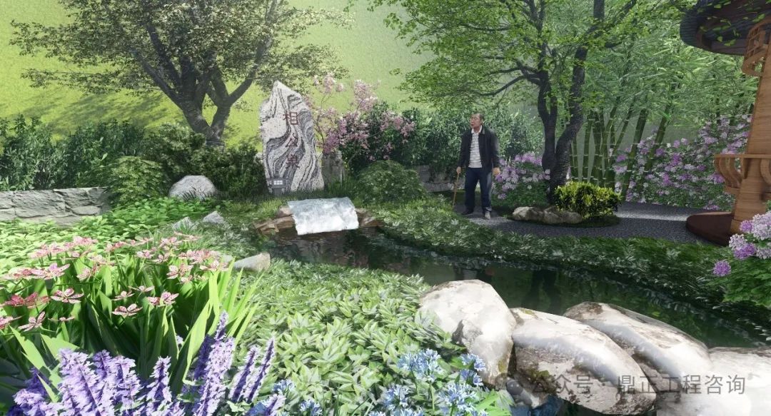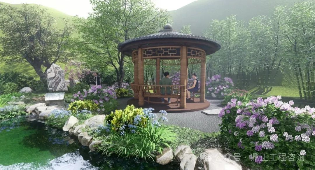 水景觀水文化打造:通過深挖相公泉歷史文化內涵,進行本地印象提煉。“相公”一詞在古代,是妻子對丈夫的稱呼,也是君子、生員(秀才、相公)、宰相的另一種叫法。君子愛茶,沏茶品茗,修煉品性,以茶可雅志,茶是象征著塵世的純潔。設計從自然山水出發,落位于閑情逸致設計基調,泉眼處采用題字景石配上一棵姿態旖旎的紅豆,視線端頭一幅竹影錦鯉、花木跌水的畫面映入眼簾,兩側的樹木林立,開合有致,整個節點的中心是一座圓頂茶亭,在亭中,一壺清茶問道,仿佛拉近了古今往事,也增加了場地的記憶,呈現出 “千年古樹頻招手,萬年清泉溢清香”的意境。