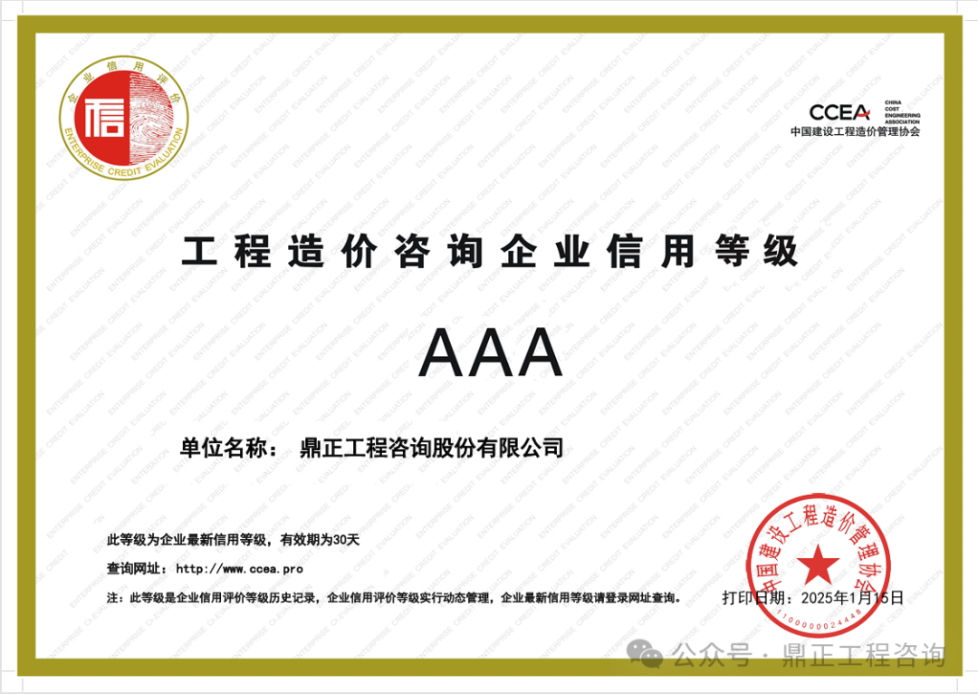 近日,中國工程咨詢協會發布了2024年度工程咨詢單位信用評價公告,鼎正憑借優異的誠信建設和信用管理能力,榮獲“AAA級信用等級”評價。