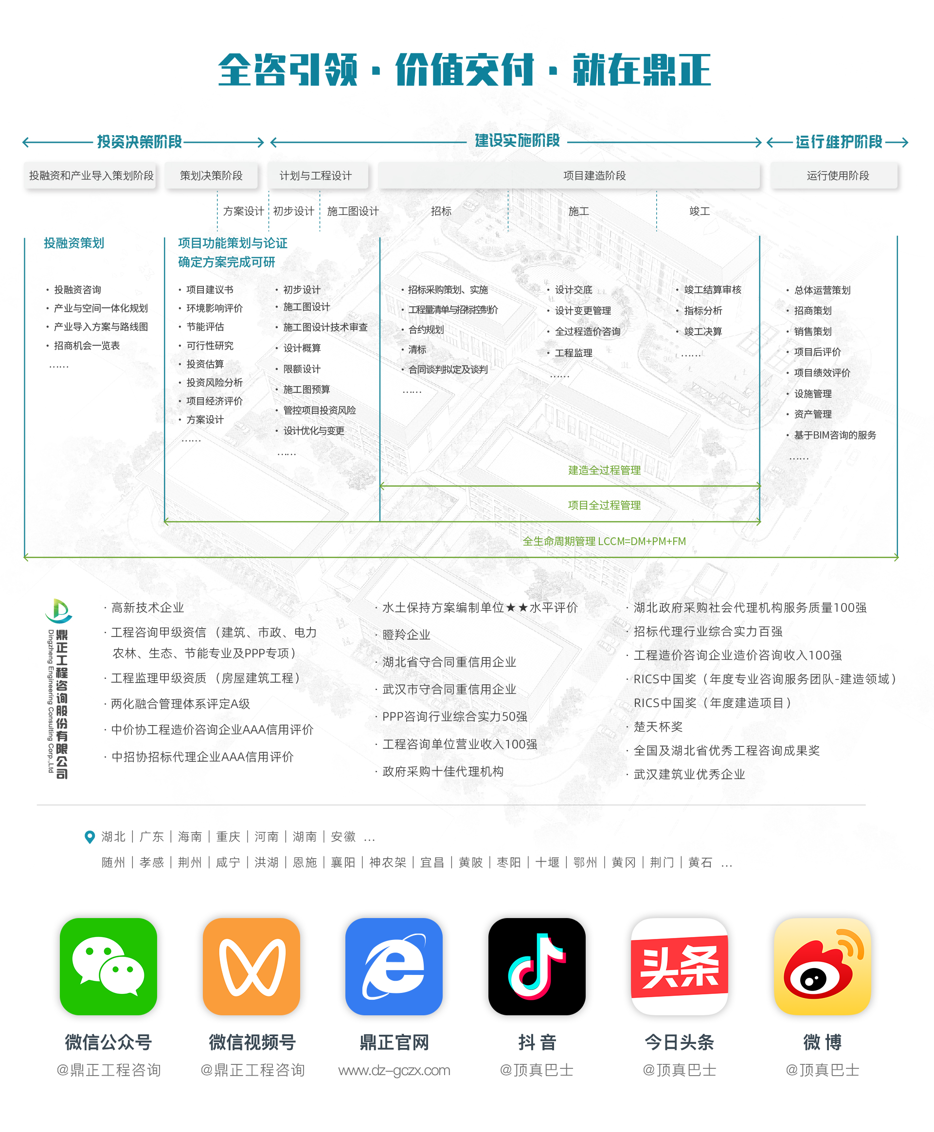 鼎正深入貫徹落實國家戰略部署,積極響應新時代發展要求,深化建設新型高端智庫,堅定不移為推動國家經濟社會高質量發展貢獻鼎正智慧。聚焦業務延鏈,鼎正成功探索并實踐了從“全過程工程咨詢”向“全域咨詢”轉型的創新發展路徑。全域咨詢服務模式通過全域全過程全方位咨詢以實現區域效益最大化,其服務涵蓋了全域戰略空間規劃、系統性項目策劃、多元化資金申報與籌措、綠色低碳發展以及項目全過程工程咨詢等,通過整合多方資源,服務邊界能夠延伸至縱向到底、橫向到邊。在這一模式的推動下,我們成功實現了從單一項目服務向區域整體增值的跨越,為客戶提供的不僅僅是單純的咨詢服務,更是一種全方位的價值創造。