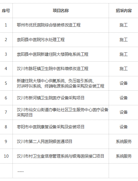 截止目前我司已為鄂州、咸寧、漢川、襄陽等地區(qū)的公立民營醫(yī)院及基層醫(yī)療衛(wèi)生機(jī)構(gòu)提供了30多個項(xiàng)目的招采服務(wù)。