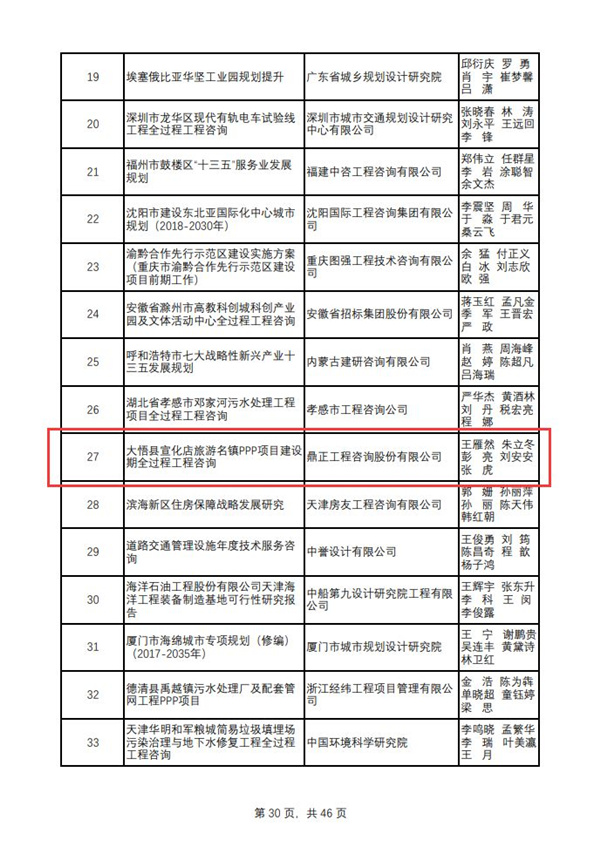 2019年12月27日,中國工程咨詢協(xié)會公布了“2018年度全國優(yōu)秀工程咨詢成果獎”獲獎項目名單,由鼎正咨詢獨立編制完成的《大悟縣宣化店旅游名鎮(zhèn)建設PPP項目全過程工程咨詢報告》榮獲全國優(yōu)秀工程咨詢成果三等獎!